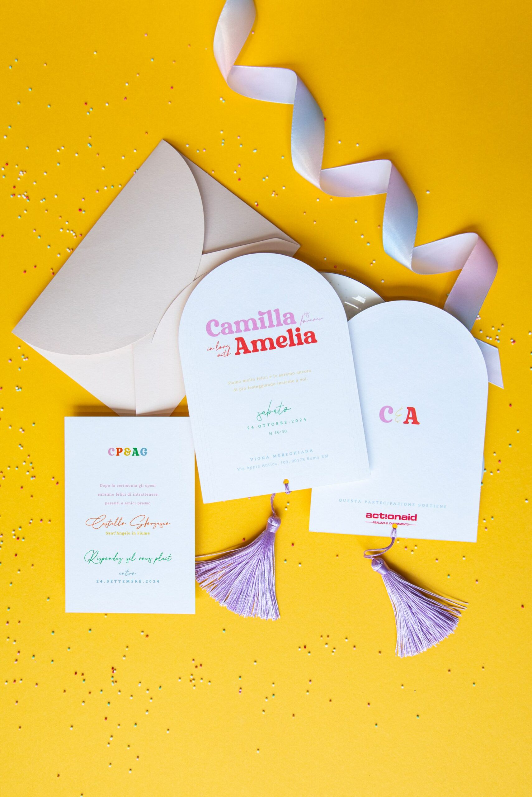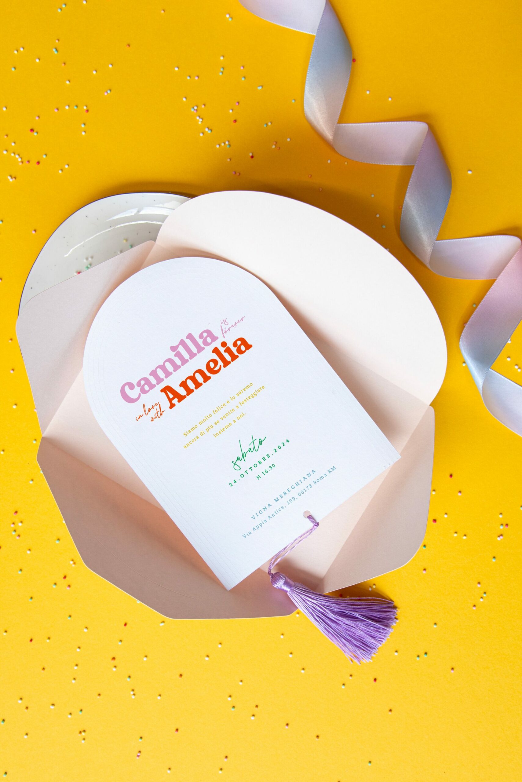 Partecipazione di nozze composta da 3 elementi: l’invito alla cerimonia, l’invito al ricevimento e la busta. A renderla unica, si aggiunge un quarto elemento: una vivace nappa viola che dondola in basso e cattura l’attenzione. Perfetta per le coppie che desiderano celebrare il loro legame in modo audace e autentico.
